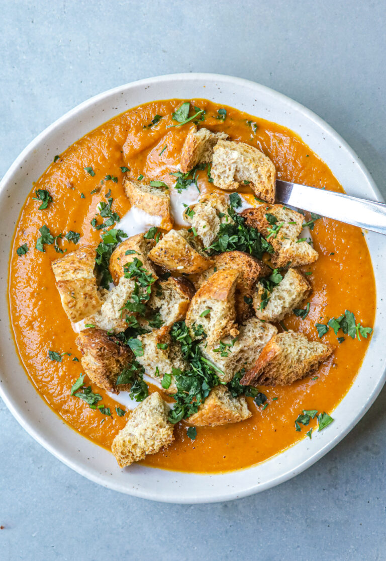Wat is er beter dan een warme, vullende en smaakvolle kom met soep? Deze geroosterde pompoensoep met zongedroogde tomaat is een van mijn favorieten. Hij staat regelmatig op het weekmenu in de herfst en winter; dan is de pompoen op z’n lekkerst! En heb je nog (oud) brood over? Maak er knapperige croutons van en geef je goedgevulde soep een extra bite. Laten we beginnen met deze allerlekkerste geroosterde pompoensoep!
