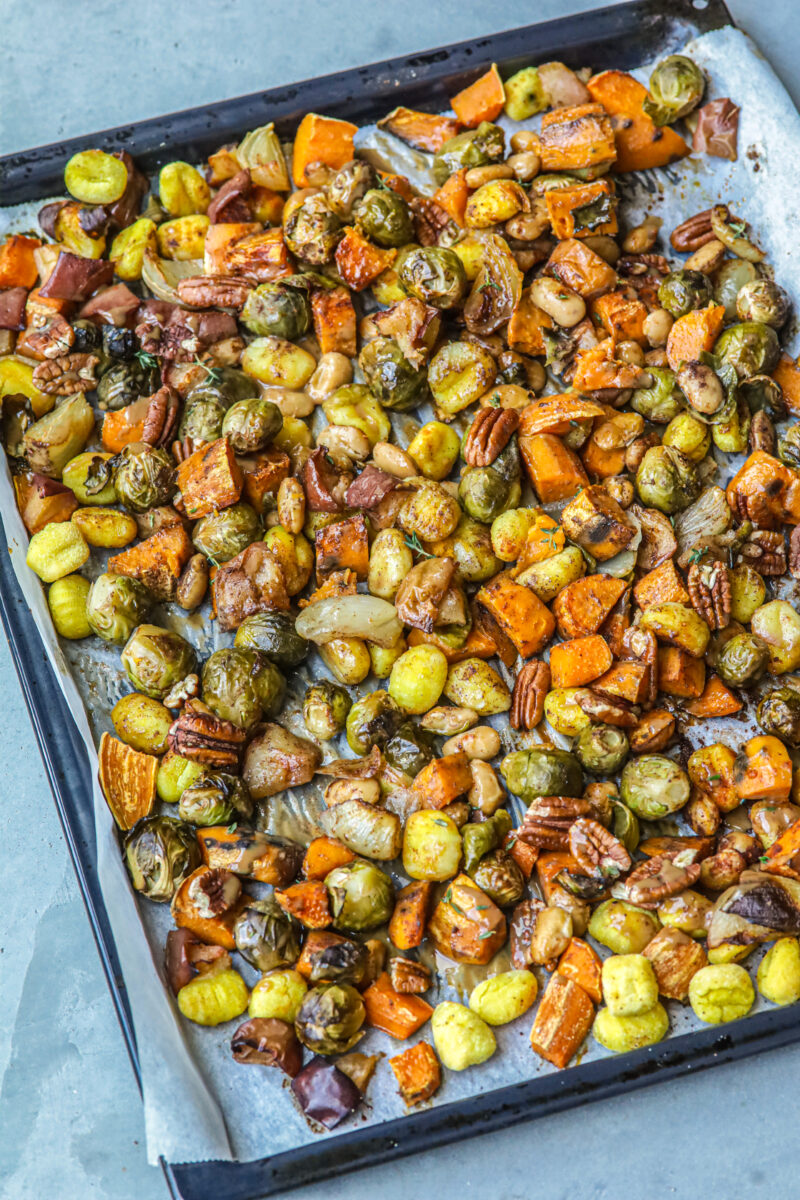 Wil je deze herfst tray bake met gnocchi en spruitjes bewaren in een van jouw borden op Pinterest? Bewaar dan deze foto op jouw Pinterest account zodat je de recepten makkelijk terug kan vinden.