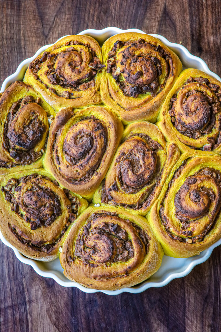Dus in deze cinnamon rolls zorgt de pompoen niet alleen voor een oranje kleurtje, maar ook voor een geweldige textuur en extra voedingsstoffen.