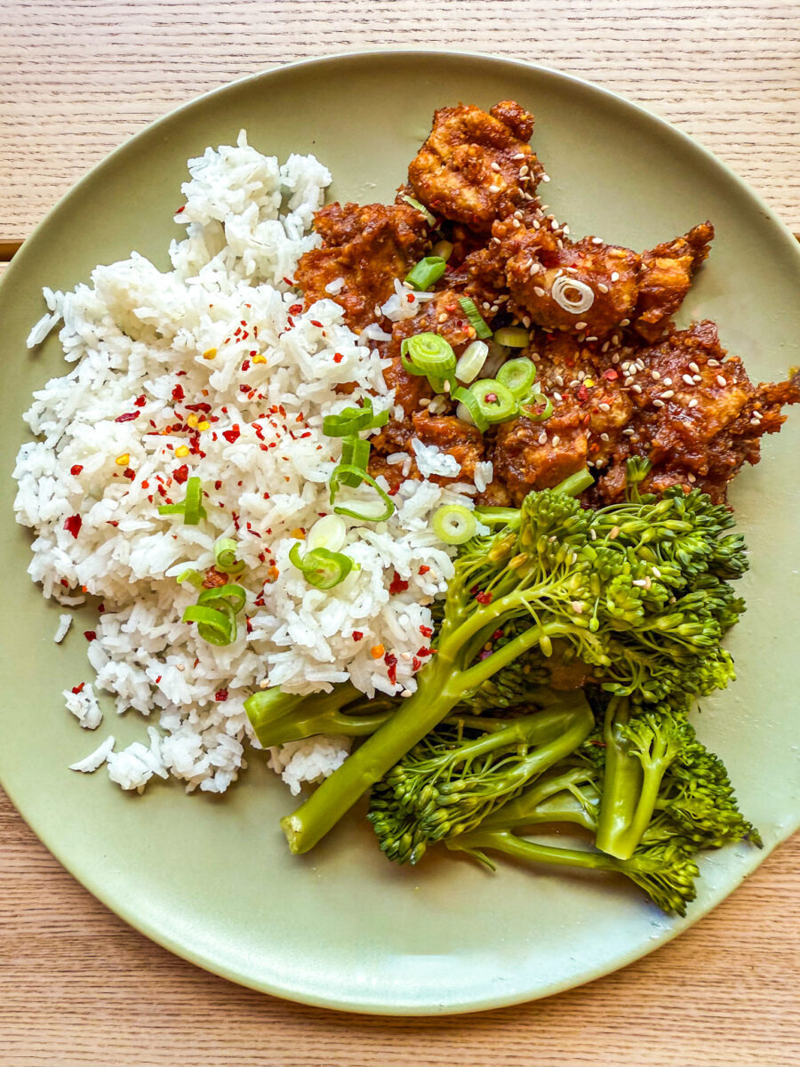 8. Serveer de sticky tofu met de rijst en gestoomde bimi. Garneer met sesamzaad, bosui en eventueel chilivlokken.