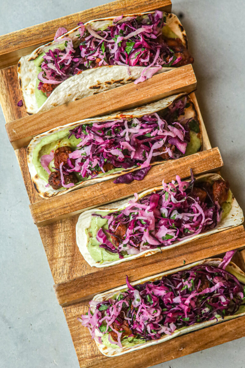 Een ouderwetse manier van groenten bewaren is inleggen. Denk aan ingelegde rode ui, ingelegde komkommer en augurken. Voor deze taco’s gaan we aan de slag met rode en witte kool: door deze te mengen met wittewijnazijn worden ze net wat zachter van structuur en zijn ze lekker fris. En je hoeft geen weken te wachten tot het klaar is; na een half uur is je groenten meestal al goed op smaak.