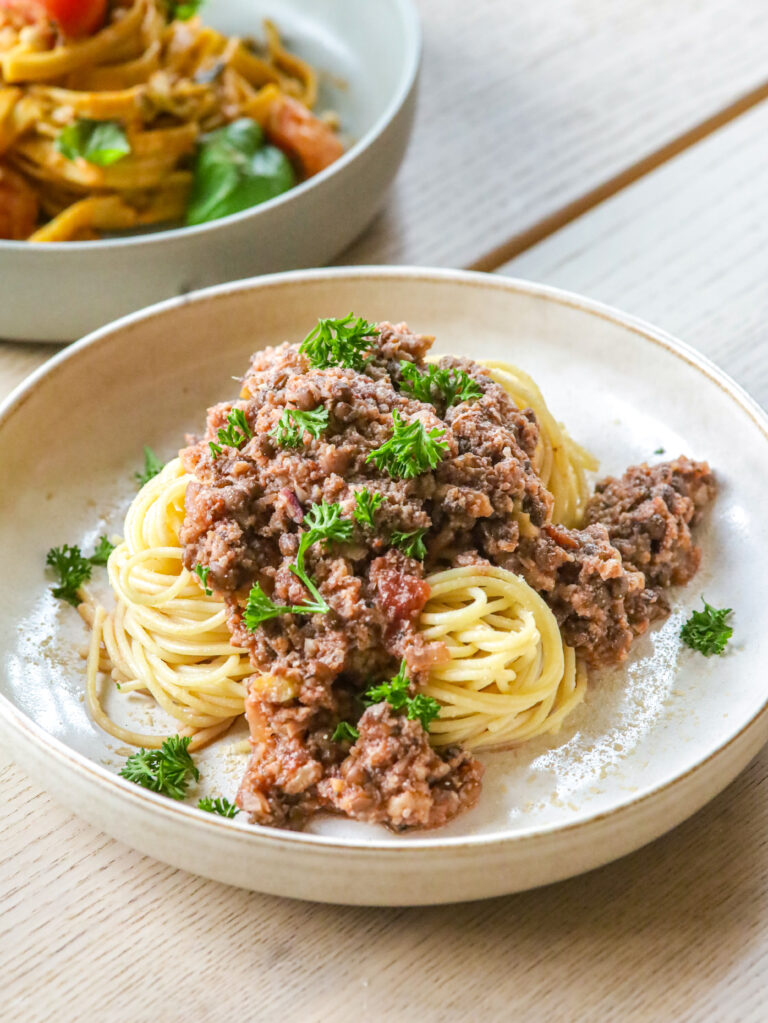 Bolognese is natuurlijk een van dé meest bekende pasta’s ter wereld. In Italië noemen ze deze pastasaus ook wel ragù; dit is een saus met vlees erin gestoofd. Om een plantaardige variant te maken kun je allerlei kanten op. Ik zorg er altijd voor dat ik een eiwitbron erin verwerk en natuurlijk lekker veel groenten.